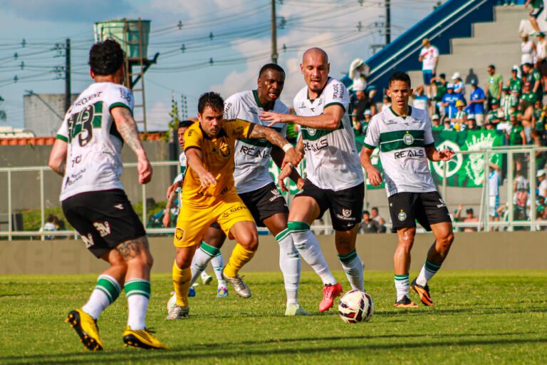 O time visitante assustou aos 31. Dellatorre bateu de canhota e foi a vez do goleiro, João Lopes fazer importante defesa. Os paranaenses abriram o placar aos 38. Em jogada de Lucas Ronier, Sebastián Gomez pegou de primeira e colocou o Coritiba em vantagem. Aos 43, Dellatorre deu bom passe para Iury Castilho, que bateu forte e estufou as redes. O VAR analisou e validou o lance. 2 a 0 Coritiba e fim do primeiro tempo.